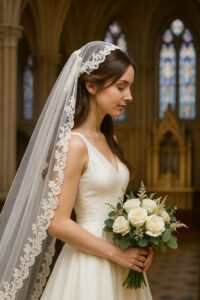 マリアベールは、頭の上から肩や背中にかけてふんわりと覆うタイプのベールで、聖母マリアが身につけていた姿に由来します。顔を覆わず後ろに流すスタイルが特徴で、上品で神聖な印象を与えるのが魅力です。レースの縁取りが施されたものが多く、クラシカルな雰囲気の挙式や大聖堂ウェディングに特によく似合います。
