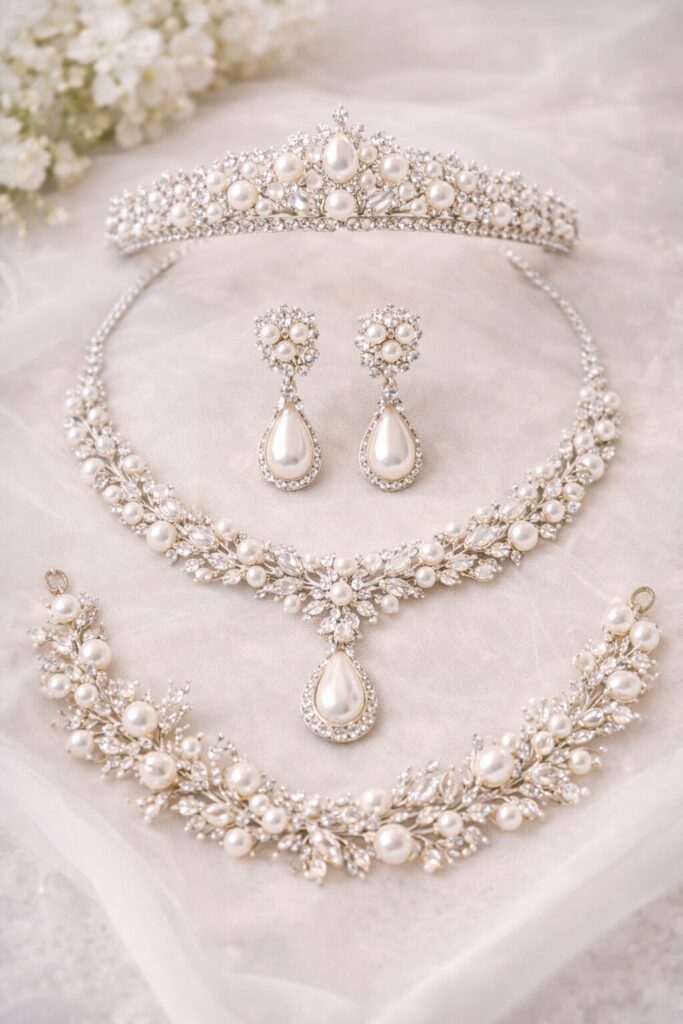 金属(シルバー・ホワイトゴールド・プラチナなど)やパール、クリスタル、淡色の天然石などが定番です。過度に異素材を混ぜたり、黒や派手な色を使った場合、フォーマル性を損ないかねません。素材選びでは控えめで上質な素材を軸にするのが無難です。