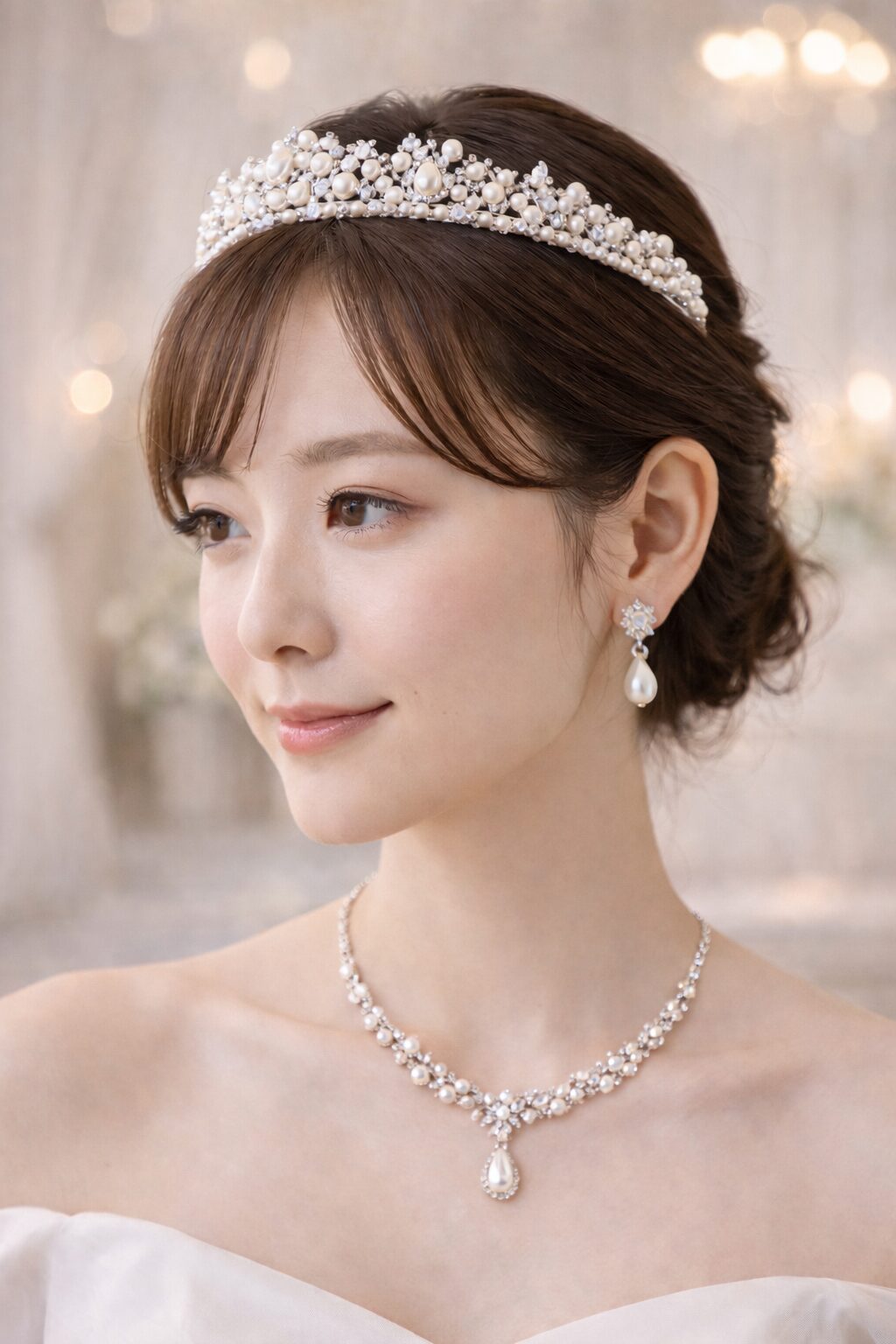髪を飾るアイテムで、挙式・披露宴いずれでも用いられます。挙式では王道のティアラを、披露宴では華やかな花飾りを選ぶなど、式の流れやドレスラインに応じて使い分けられます。王冠風のクラウンタイプは存在感があり、花飾りで統一感を出す場合はブーケと同じ花材を用いることもあります。 - ネックレス・イヤリング(またはピアス)